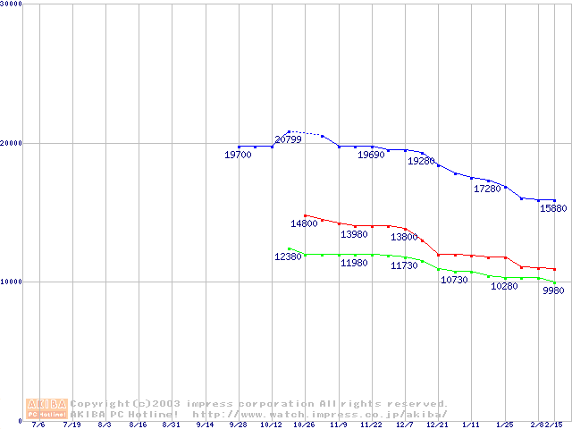 | [↑前グラフ]: | Barracuda ATA V (7200rpm,UltraATA/100,8MB,60GB/Platter,FDB)の最安値推移 |