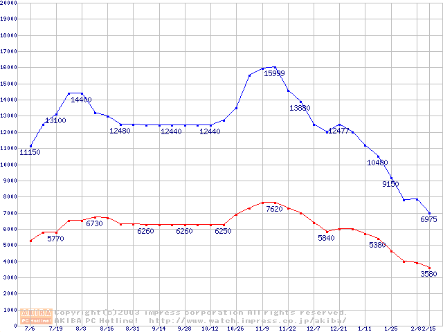 | [↓次グラフ]: | PC2700(DDR333) DDR SDRAM DIMM ECC対応 Registeredタイプの最安値推移 |