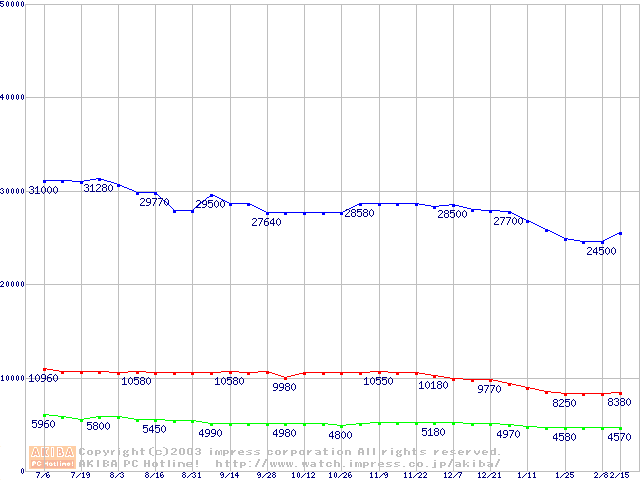 | [↓次グラフ]: | PC800-40 DRDRAM RIMM ECC対応の最安値推移 |