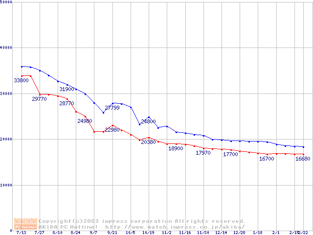 | [↑前グラフ]: | 2.5インチHDD 40GB~50GB未満(9.5mm厚,4200rpm)の最安値推移 |