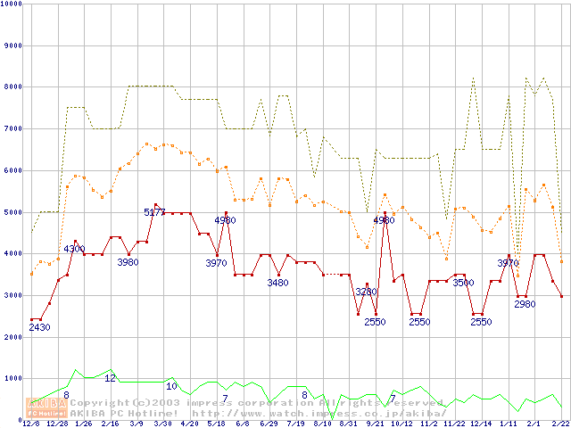 PC133 SDRAM DIMM CasLatency=3 ECC対応の最安値推移
