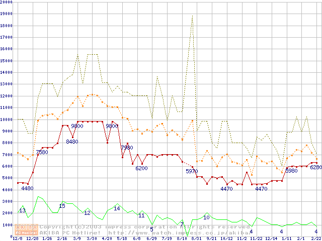 PC133 SDRAM DIMM CasLatency=3 ECC対応の最安値推移
