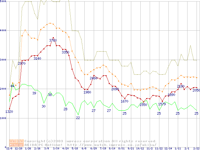 PC100 SDRAM DIMM CasLatency=2の最安値推移