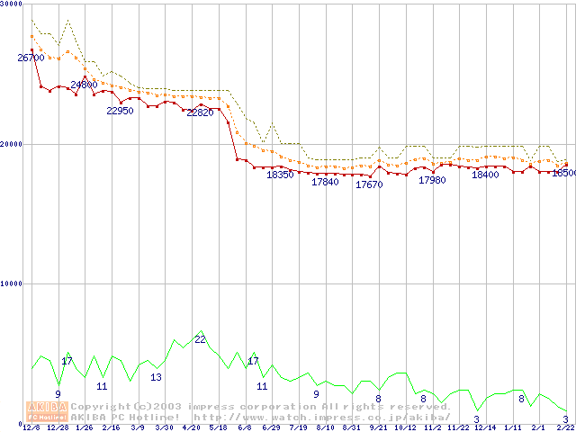 Socket 370 (FC-PGA2,FSB 133MHz,L2 512KB,Tualatin)の最安値推移