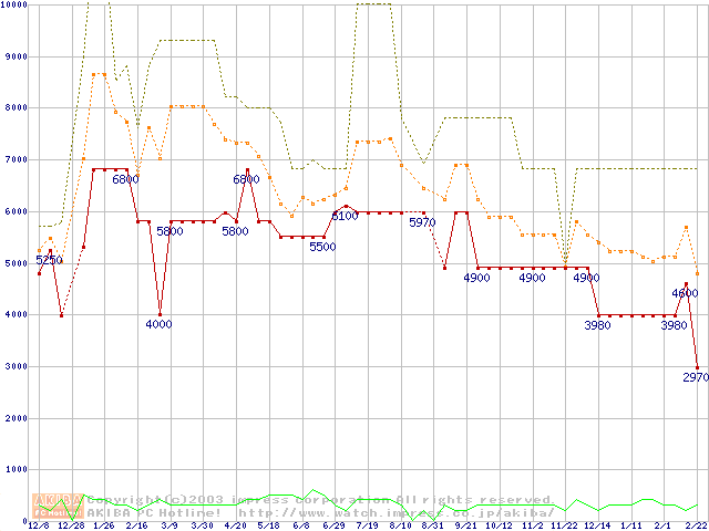 PC100 SDRAM DIMM CasLatency=2 ECC対応 Registeredタイプの最安値推移