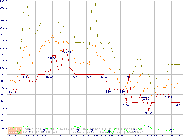 PC100 SDRAM DIMM CasLatency=2 ECC対応 Registeredタイプの最安値推移