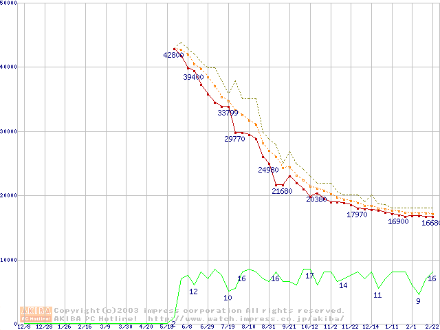 Travelstar 40GNX (9.5mm,5400rpm,UltraATA/100,8MB,FDB,20GB/Platter)の最安値推移