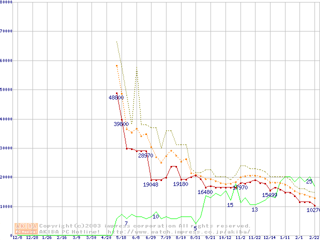 PC3200(DDR400) DDR SDRAM DIMMの最安値推移