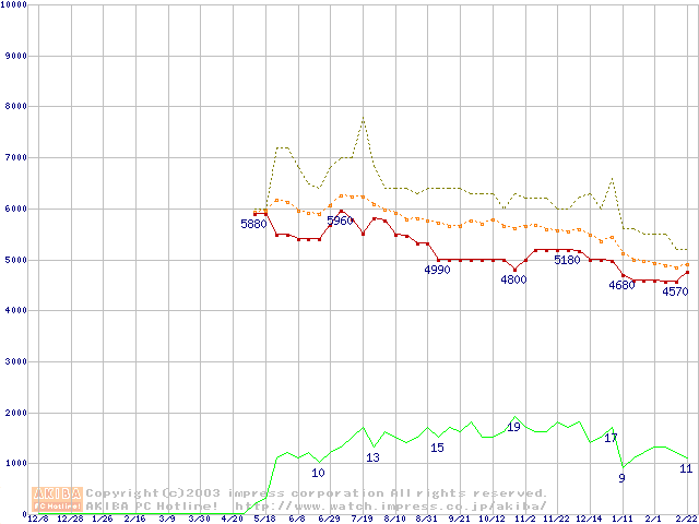 メモリ主要製品(最安値5千円未満)の最安値推移