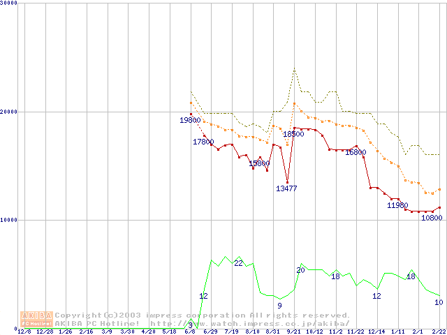 メモリ主要製品(最安値1万円以上)の最安値推移