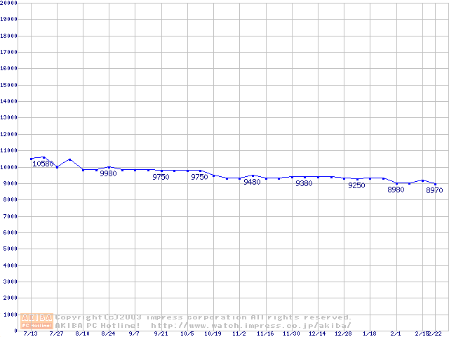 | [↑前グラフ]: | MHSシリーズ (9.5mm,4200rpm,UltraATA/100,2MB,FDB,30GB/Platter,FDB)の最安値推移 |