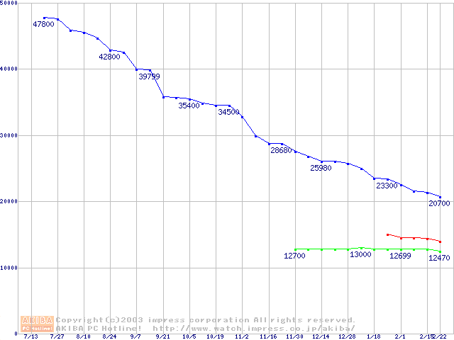| [↑前グラフ]: | MKシリーズ (9.5mm,5400rpm,16MB,FDB,20GB/Platter)の最安値推移 |