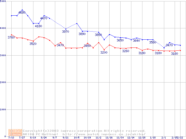 | Socket A (PGA,FSB 200MHz,L2 64KB,Spitfire)の最安値推移 |