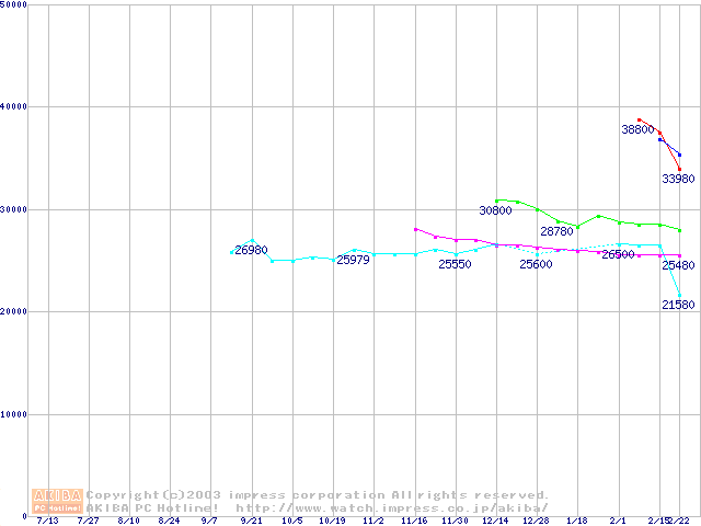 | Socket A (OPGA,FSB 266MHz,L2 256KB,Thoroughbred)の最安値推移 |