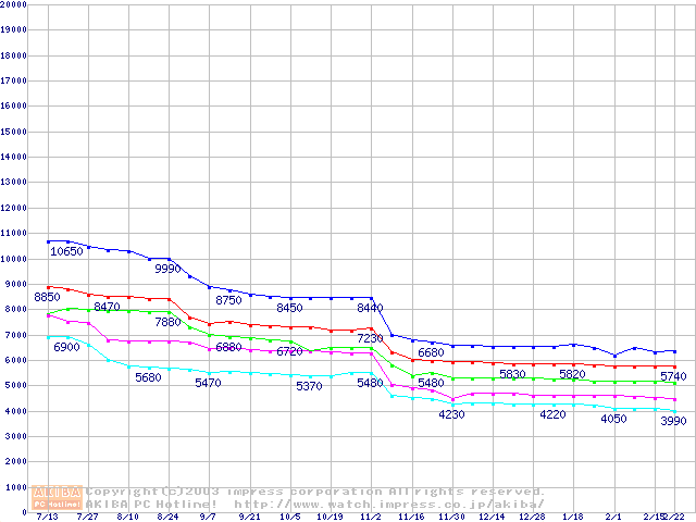 | [↓次グラフ]: | Socket 370 (FC-PGA,FSB 100MHz,L2 128KB,Coppermine)の最安値推移 |