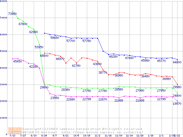 | [↑前グラフ]: | Socket 478 (micro-PGA,FSB 533MHz,L2 512KB,Hyper-Threading,Northwood)の最安値推移 |
