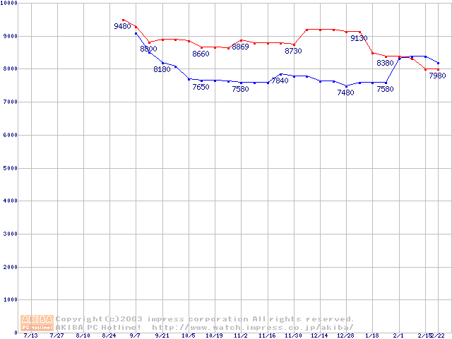 | [↑前グラフ]: | DiamondMax Plus 9 (7200rpm,2MB,UltraATA/133,FDB)の最安値推移 |