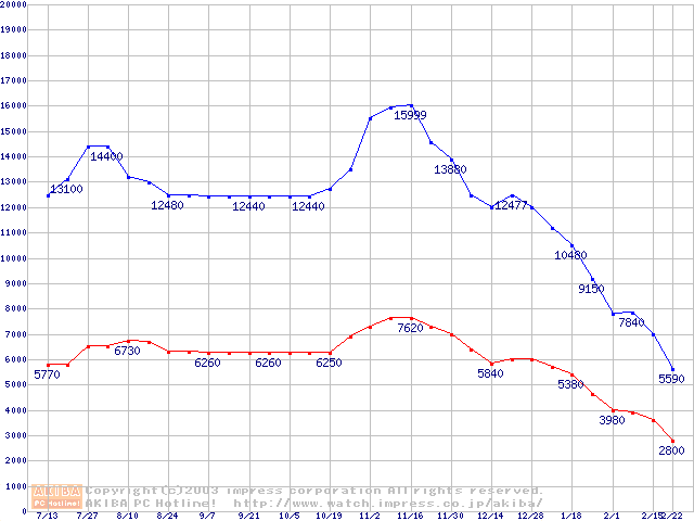 | [↓次グラフ]: | PC2700(DDR333) DDR SDRAM DIMM ECC対応 Registeredタイプの最安値推移 |