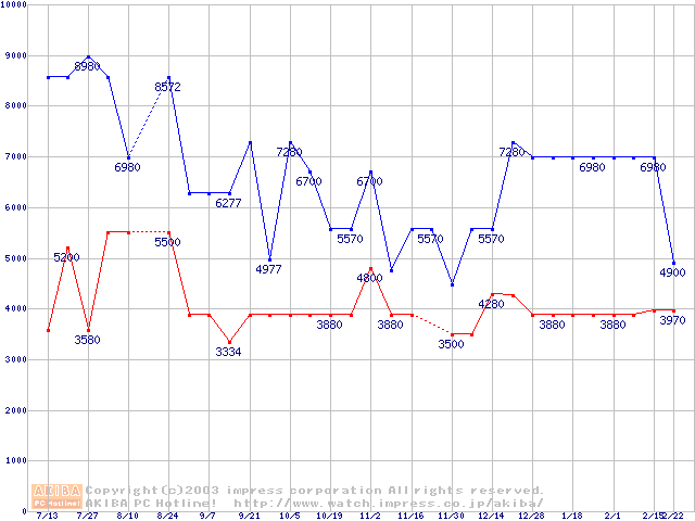 | [↑前グラフ]: | PC100 SDRAM DIMM CasLatency=2の最安値推移 |