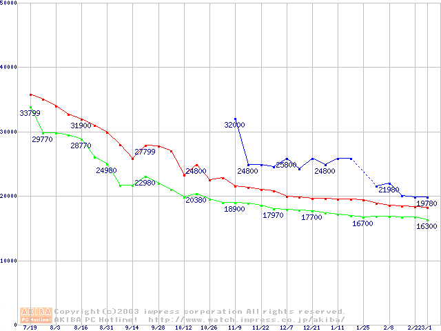 | [↓次グラフ]: | 2.5インチHDD主要製品(最安値2万円~3万円未満)の最安値推移 |