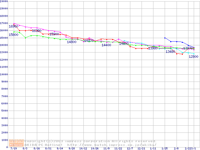| [↑前グラフ]: | 2.5インチHDD 30GB~40GB未満(9.5mm厚)の最安値推移 |