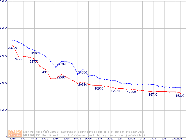 | [↑前グラフ]: | 2.5インチHDD 40GB~50GB未満(9.5mm厚,4200rpm)の最安値推移 |
