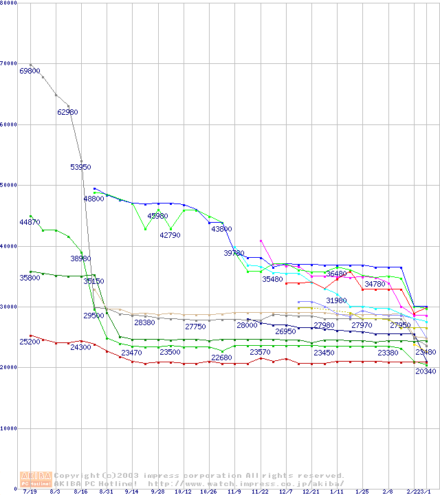 CPU主要製品(最安値2万円~3万円未満)の最安値推移
