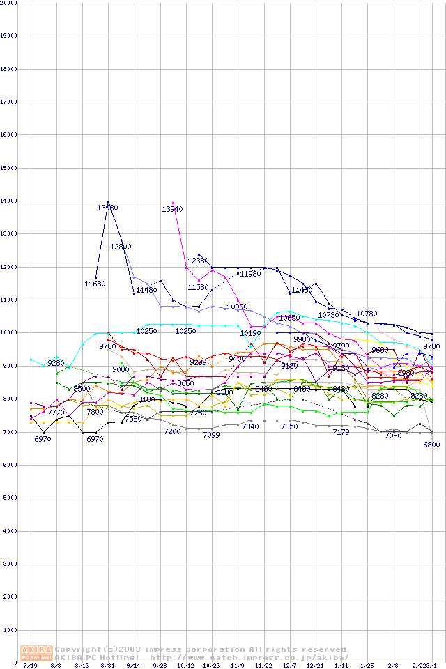 HDD主要製品(最安値1万円~1万5千円未満)の最安値推移