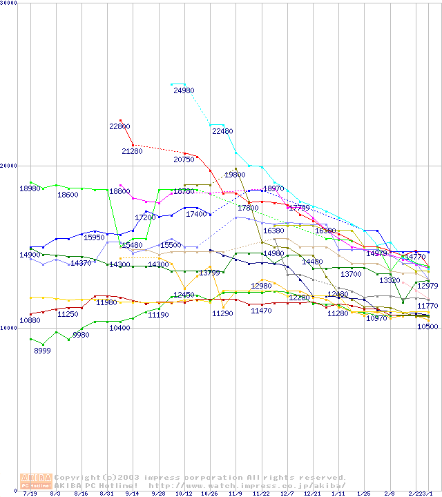 HDD主要製品(最安値1万5千円~2万円未満)の最安値推移