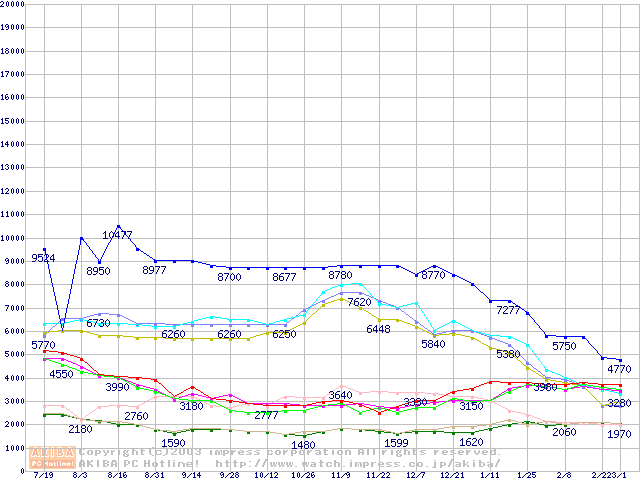 メモリ主要製品(最安値5千円~1万円未満)の最安値推移