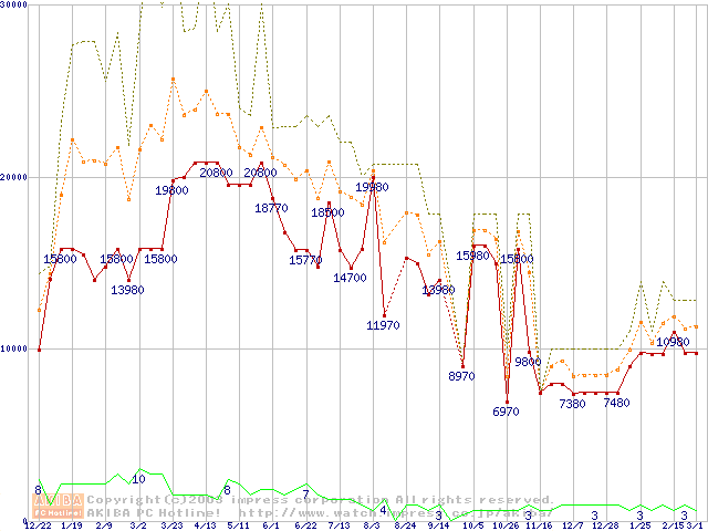 PC133 SDRAM DIMM CasLatency=3 ECC対応の最安値推移
