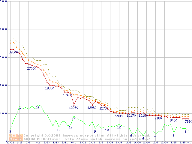 Socket A (OPGA,FSB 266MHz,L2 256KB,Palomino)の最安値推移