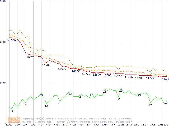 Travelstar 40GN (9.5mm,4200rpm,UltraATA/100,2MB,FDB,20GB/Platter)の最安値推移
