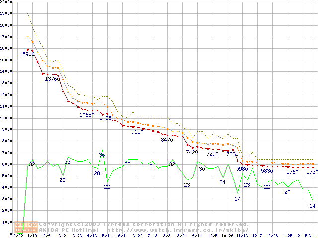 Socket 370 (FC-PGA2,FSB 100MHz,L2 256KB,Tualatin)の最安値推移