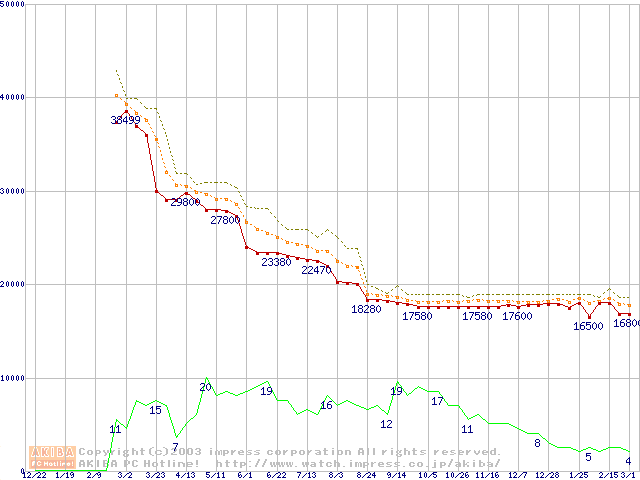 Socket A (OPGA,FSB 266MHz,L2 256KB,Palomino)の最安値推移