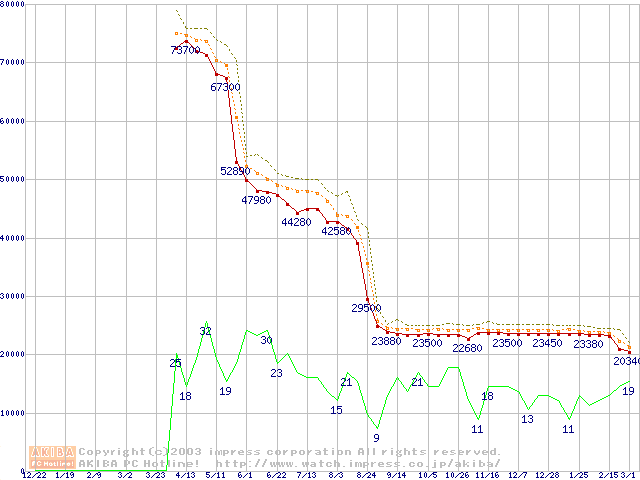 Socket 478 (micro-PGA,FSB 400MHz,L2 512KB,Northwood)の最安値推移