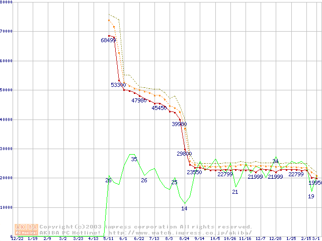 Socket 478 (micro-PGA,FSB 533MHz,L2 512KB,Northwood)の最安値推移