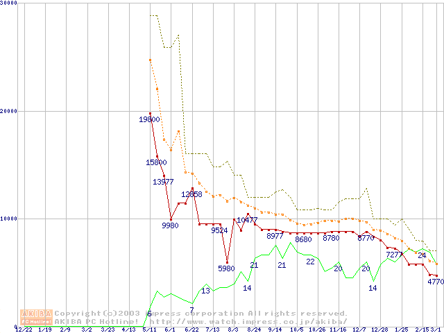 PC3200(DDR400) DDR SDRAM DIMMの最安値推移