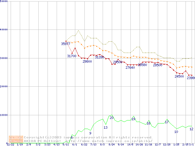 メモリ主要製品(最安値1万円以上)の最安値推移