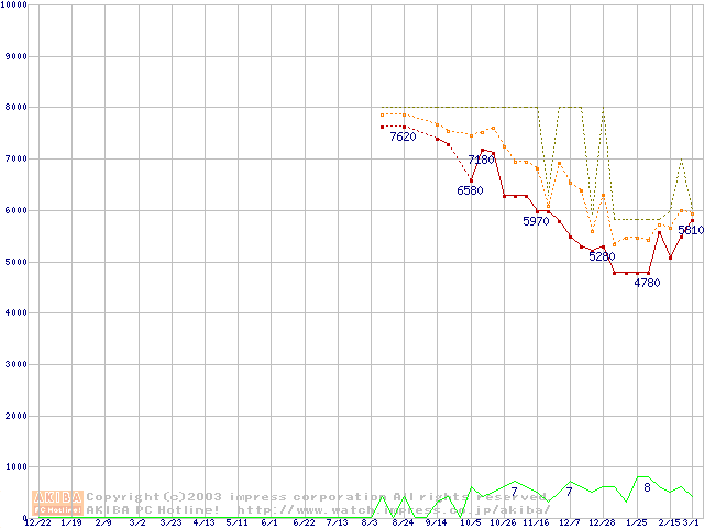 Socket 370 (FC-PGA,FSB 100MHz,L2 128KB,Coppermine)の最安値推移