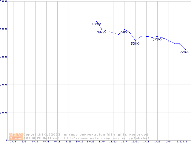 | [↑前グラフ]: | Travelstar 40GN (9.5mm,4200rpm,UltraATA/100,2MB,FDB,20GB/Platter)の最安値推移 |