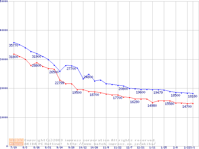 | [↑前グラフ]: | MKシリーズ (9.5mm,5400rpm,16MB,FDB,30GB/Platter)の最安値推移 |