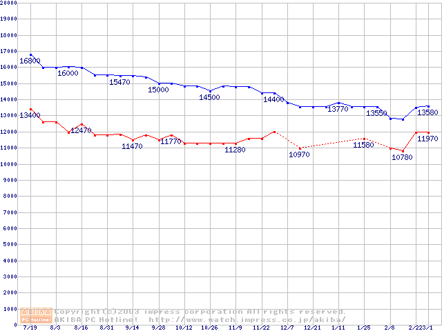 | [↑前グラフ]: | MKシリーズ (9.5mm,4200rpm,2MB,FDB,20GB/Platter)の最安値推移 |