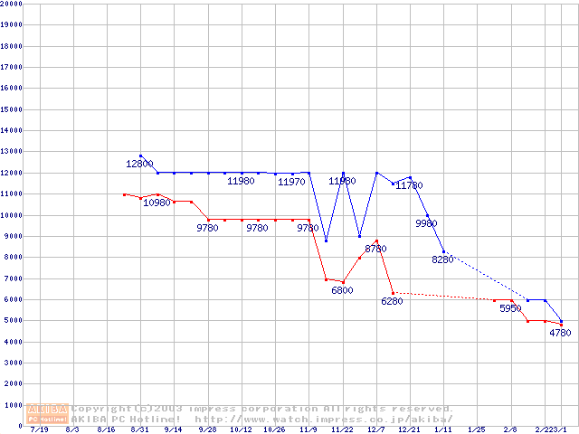 | [↓次グラフ]: | Socket A (OPGA,FSB 266MHz,L2 256KB,Thoroughbred)の最安値推移 |