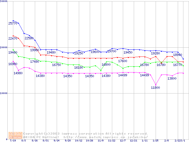 | [↑前グラフ]: | Socket A (OPGA,FSB 266MHz,L2 256KB,Thoroughbred)の最安値推移 |