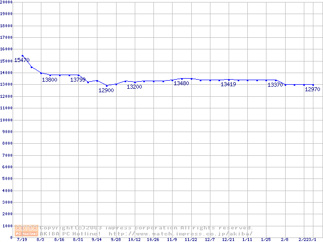 | [↑前グラフ]: | Socket 370 (FC-PGA2,FSB 133MHz,L2 512KB,Tualatin)の最安値推移 |