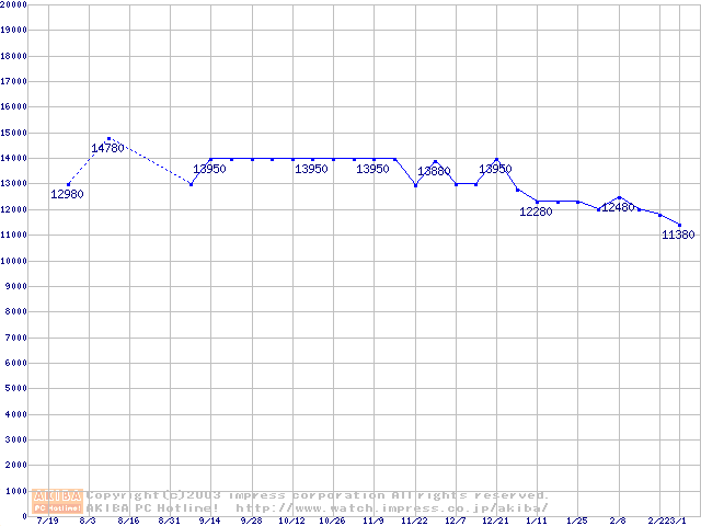 | [↑前グラフ]: | Socket 370 (FC-PGA2,FSB 133MHz,L2 256KB,Tualatin)の最安値推移 |