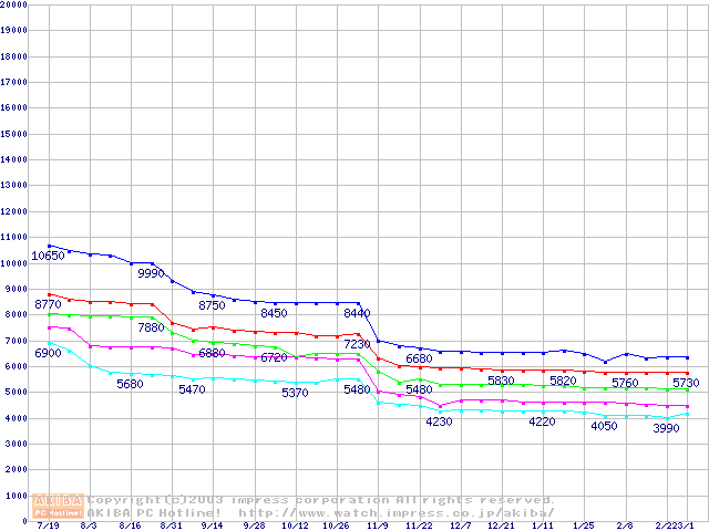 | [↑前グラフ]: | Socket 370 (FC-PGA,FSB 133MHz,L2 256KB,Coppermine)の最安値推移 |