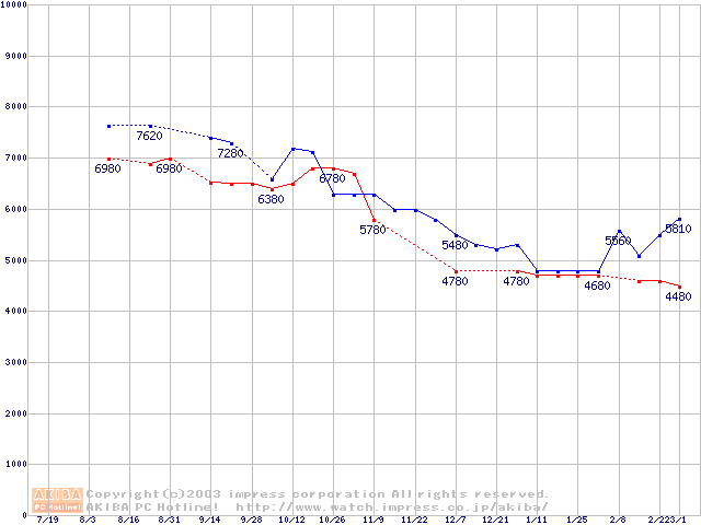 | [↓次グラフ]: | Socket 370 (FC-PGA,FSB 66MHz,L2 128KB,Coppermine)の最安値推移 |