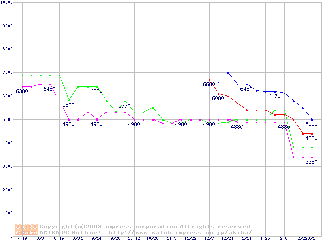 | [↑前グラフ]: | Socket 370 (PGA,FSB 133MHz,L2 64KB,Nehemiah)の最安値推移 |